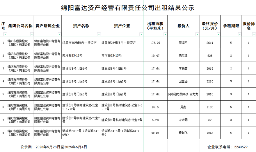 綿陽富達資產(chǎn)經(jīng)營有限責任公司出租結(jié)果公示