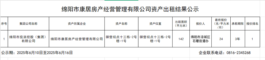 綿陽(yáng)市康居房產(chǎn)經(jīng)營(yíng)管理有限公司資產(chǎn)出租結(jié)果公示