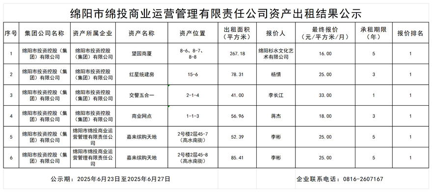 綿陽市綿投商業(yè)運營管理有限責任公司資產(chǎn)出租結果公示