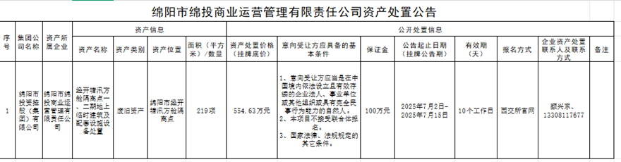 綿陽(yáng)市綿投商業(yè)運(yùn)營(yíng)管理有限責(zé)任公司資產(chǎn)處置公告