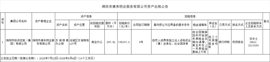 綿陽市康來物業(yè)服務(wù)有限公司資產(chǎn)出租公告