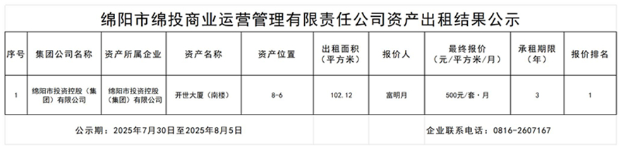 綿陽市綿投商業(yè)運(yùn)營管理有限責(zé)任公司資產(chǎn)出租結(jié)果公示