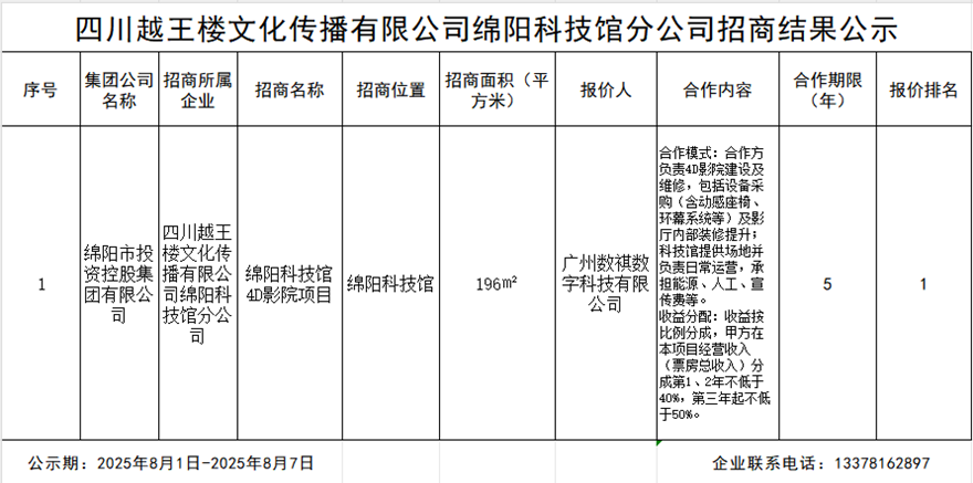 四川越王樓文化傳播有限公司綿陽科技城分公司招商結(jié)果公示