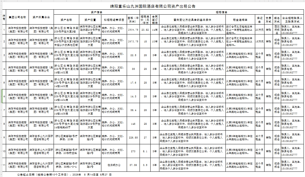 綿陽富樂山九洲國際酒店有限公司資產出租公告