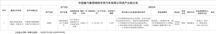 中國重汽集團綿陽專用汽車有限公司資產(chǎn)出租公告