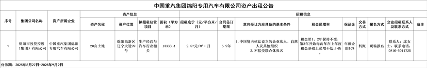 中國重汽集團(tuán)綿陽專用汽車有限公司資產(chǎn)出租公告