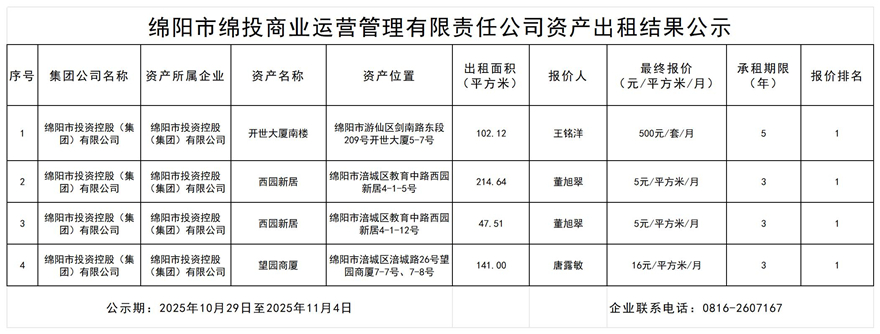 綿陽市綿投商業(yè)運(yùn)營管理有限責(zé)任公司資產(chǎn)出租結(jié)果公示