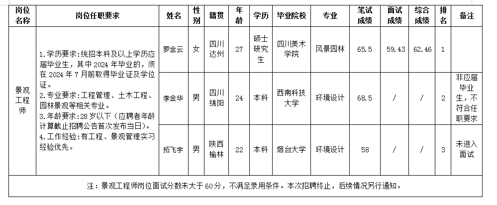 根據(jù)綿陽(yáng)市綿投置地有限公司發(fā)布的招聘公告及招聘相關(guān)規(guī)定,經(jīng)筆試、面試等程序,現(xiàn)將筆試、面試成績(jī)予以公示。
