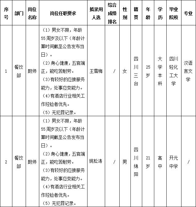 【公開招聘】綿陽市東津酒店管理有限責任公司關于招聘廚師崗位擬錄用人員的公示