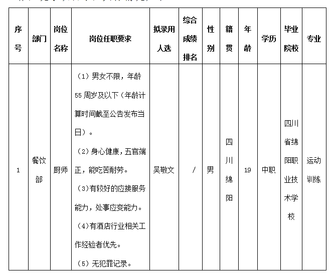 根據(jù)綿陽市東津酒店管理有限責(zé)任公司發(fā)布的招聘公告及招聘相關(guān)規(guī)定,通過面試等程序,錄用吳敬文同志到餐飲部工作,現(xiàn)予以公示,具體情況如下:
