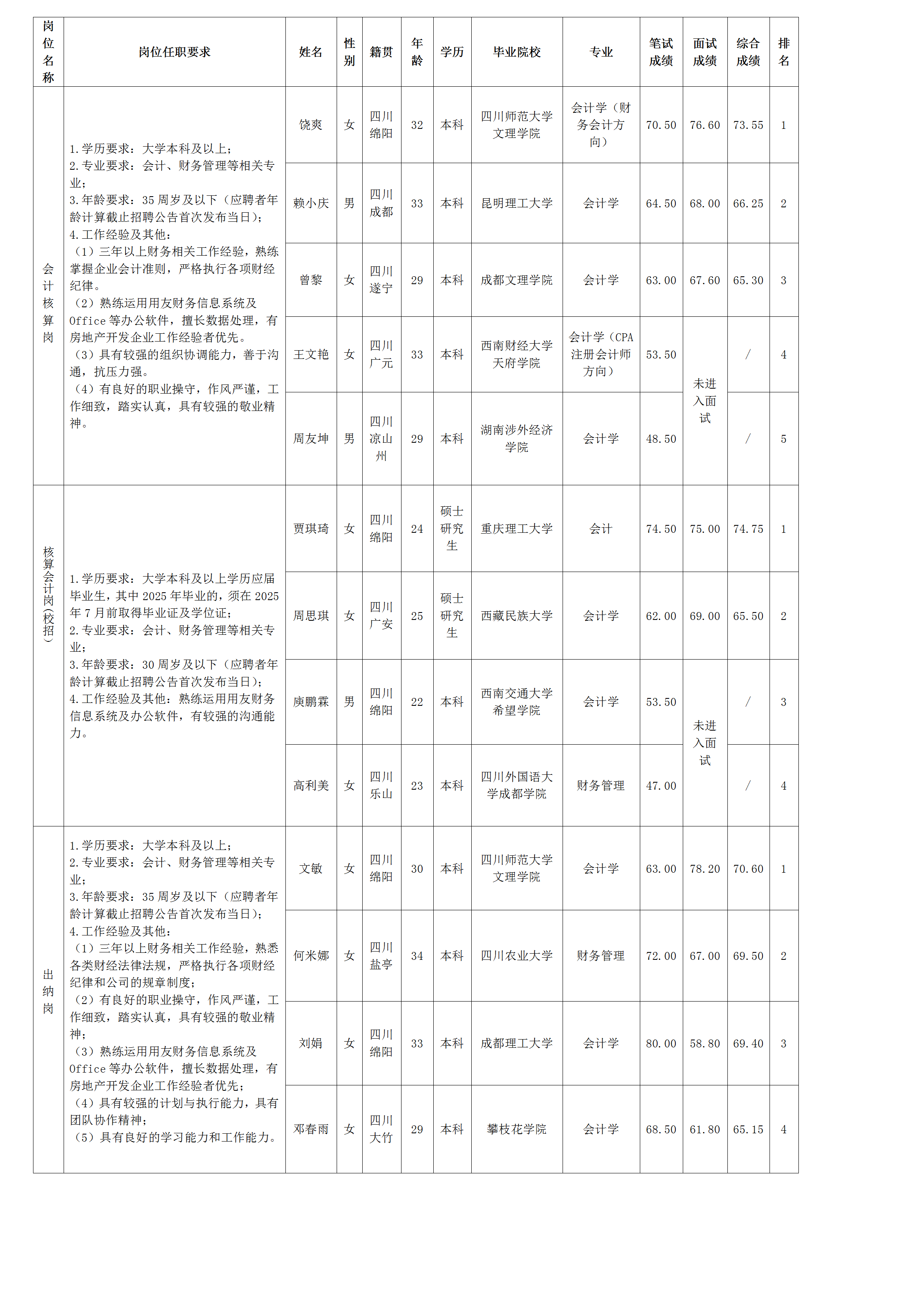根據(jù)綿陽市綿投置地有限公司發(fā)布的招聘公告及招聘相關規(guī)定,經筆試、面試等程序,現(xiàn)將筆試、面試成績予以公示。