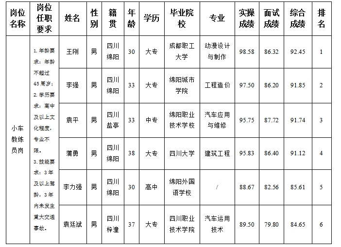 【公開招聘】綿陽市汽車實(shí)驗(yàn)駕駛技術(shù)學(xué)校股份有限公司關(guān)于招聘小車教練員崗位測試成績的公示