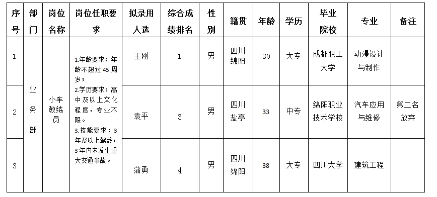 根據(jù)綿陽市汽車實驗駕駛技術(shù)學校股份有限公司發(fā)布的招聘公告及招聘相關(guān)規(guī)定,經(jīng)實操、面試、考察、體檢等程序,擬錄用王剛等3位同志到綿陽市汽車實驗駕駛技術(shù)學校股份有限公司工作,現(xiàn)予以公示,具體情況如下: