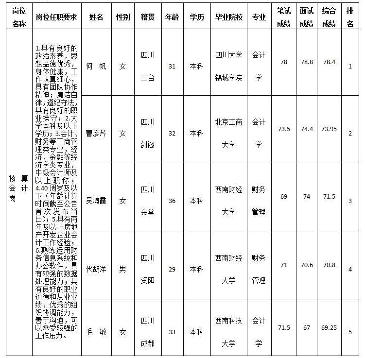 【公開招聘】綿陽市嘉遠(yuǎn)瑞華房地產(chǎn)開發(fā)有限公司關(guān)于招聘核算會(huì)計(jì)崗測(cè)試成績(jī)的公示
