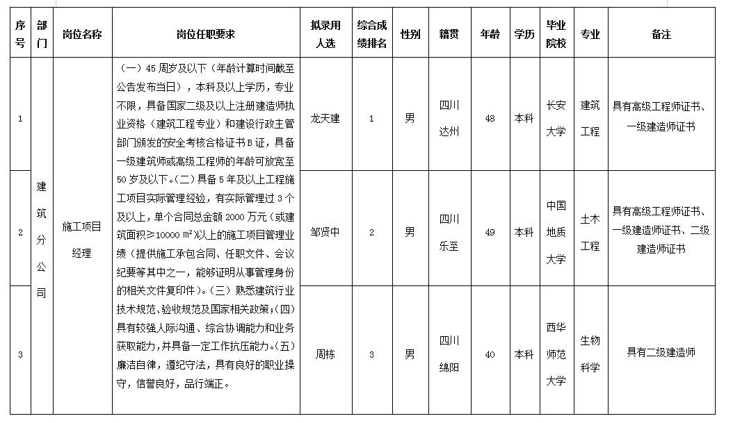 【公開招聘】四川嘉來建筑工程有限公司關(guān)于招聘施工項(xiàng)目經(jīng)理崗擬錄用人員的公示
