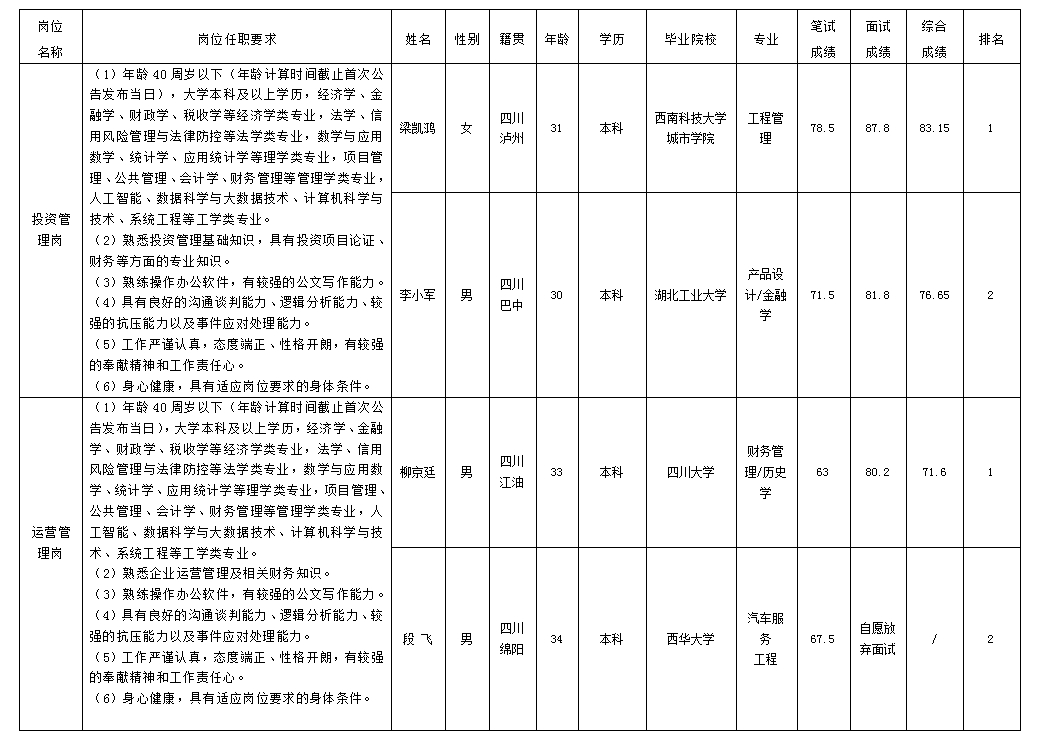 【內(nèi)部競聘】綿陽市投資控股(集團)有限公司 關于內(nèi)部選聘投資管理崗等崗位測試成績的公示
