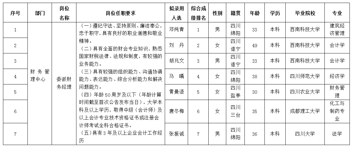 根據(jù)綿陽市投資控股(集團(tuán))有限公司發(fā)布的招聘公告及招聘相關(guān)規(guī)定,經(jīng)筆試、面試、考察等程序,擬錄用鄧純青等同志作為集團(tuán)委派財務(wù)經(jīng)理崗位擬錄用人員,現(xiàn)予以公示,具體情況如下: