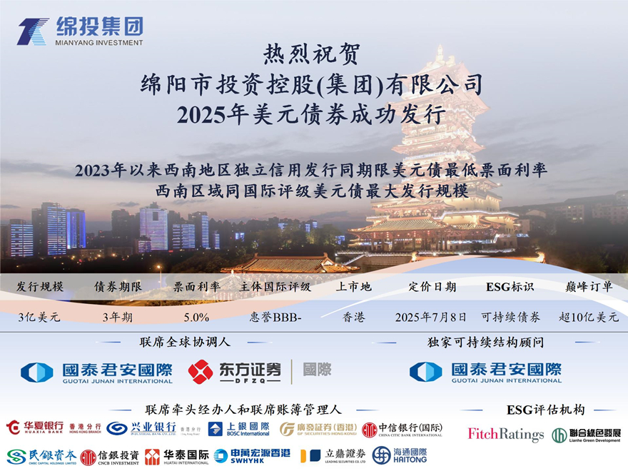 7月8日,綿投集團成功定價發(fā)行3億美元、3年期可持續(xù)美元債券,認購倍數(shù)3.43倍(峰值訂單超10億美元),最終票面利率強勢鎖定5.00%,較初始價格指引大幅收窄70個基點,創(chuàng)2023年以來西南地區(qū)獨立信用發(fā)行同期限境外美元債最低票面利率、西南區(qū)域同國際評級美元債最大發(fā)行規(guī)模,以及創(chuàng)2025年以來中資投資級地方國企美元債最大收窄幅度。