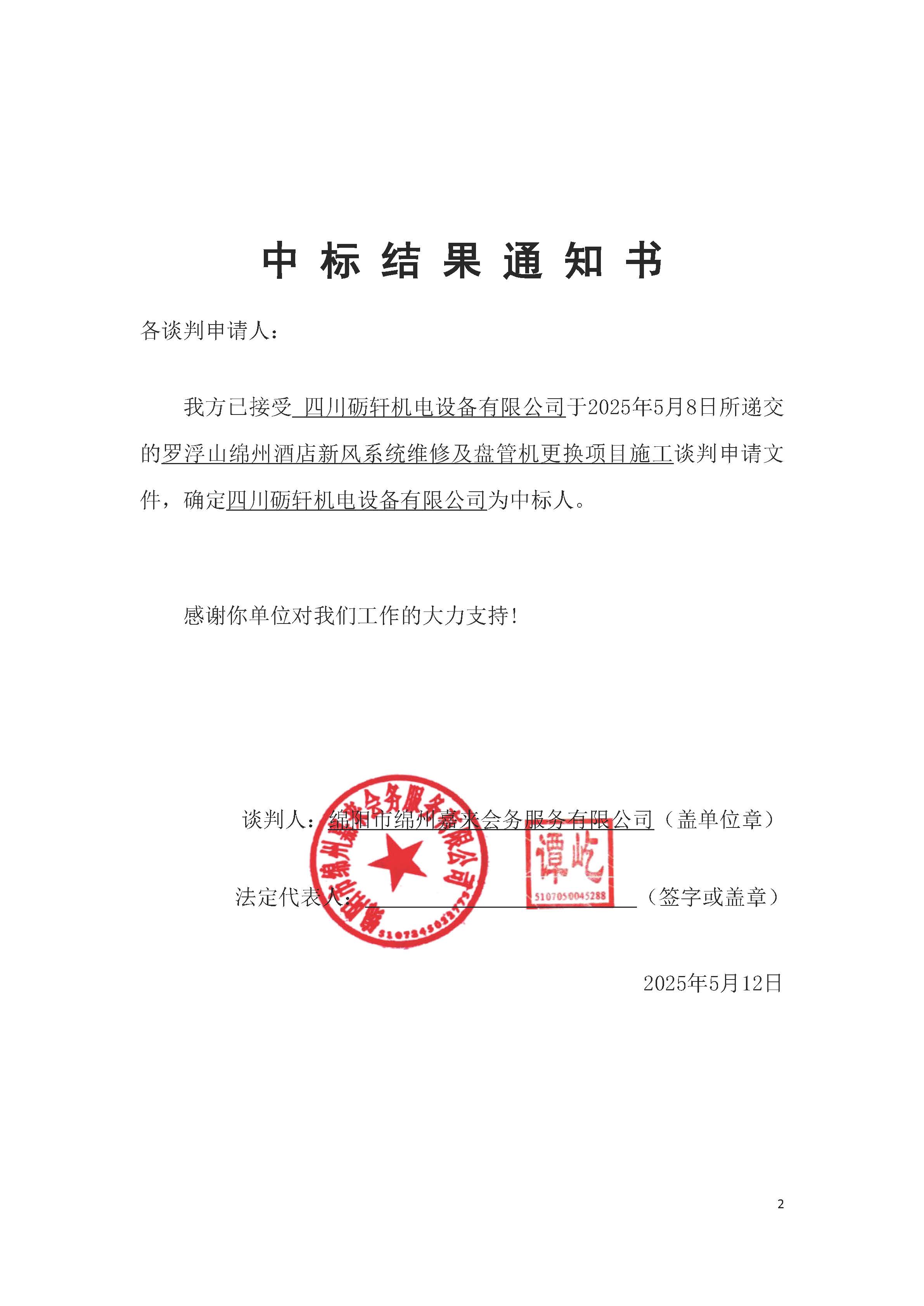 羅浮山綿州酒店新風系統(tǒng)維修及盤管機更換項目施工中標結果通知